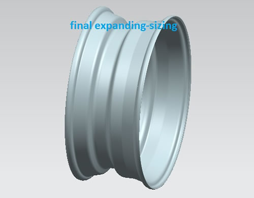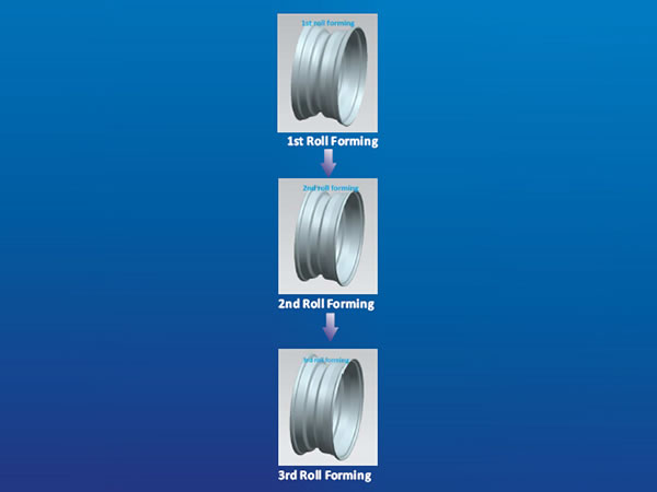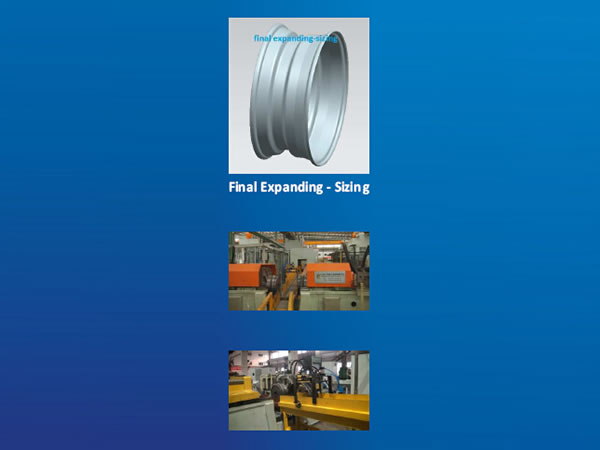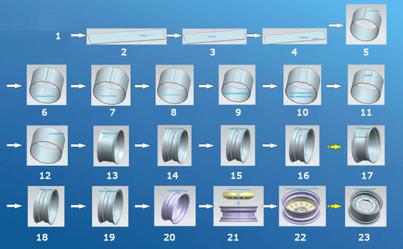 13. الطوي الأولي 14. عملية التشكيل الأولى 15. عملية التشكيل الثانية 16. عملية التشكيل الثالثة 17. عملية التشكيل الرابعة لنمط غير منزلق 18. طوي الحافة 19. تمديد نهائي 20. تخريم ثقب الصمام 21. لحام مدمج للجنط والأسطوانة 22. تثبيت جنط وأسطوانة العجلة 23. تثبيت أو ربط العجلة والأسطوانة |