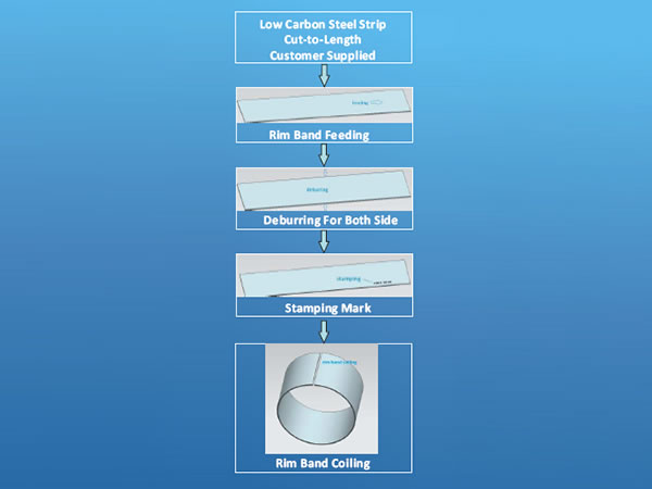 2. تغذية رباط جنط العجلة 3. إزالة حواف الجانبين 4. ختم العلامة 5. لف رباط جنط العجلة 6. تسطيح وصلة اللحام 7. لحام المقاومة الكهربائية AC 8. تشذيب نفايا اللحام 9. الصقل 10. القطع الطرفي 11. التبريد |